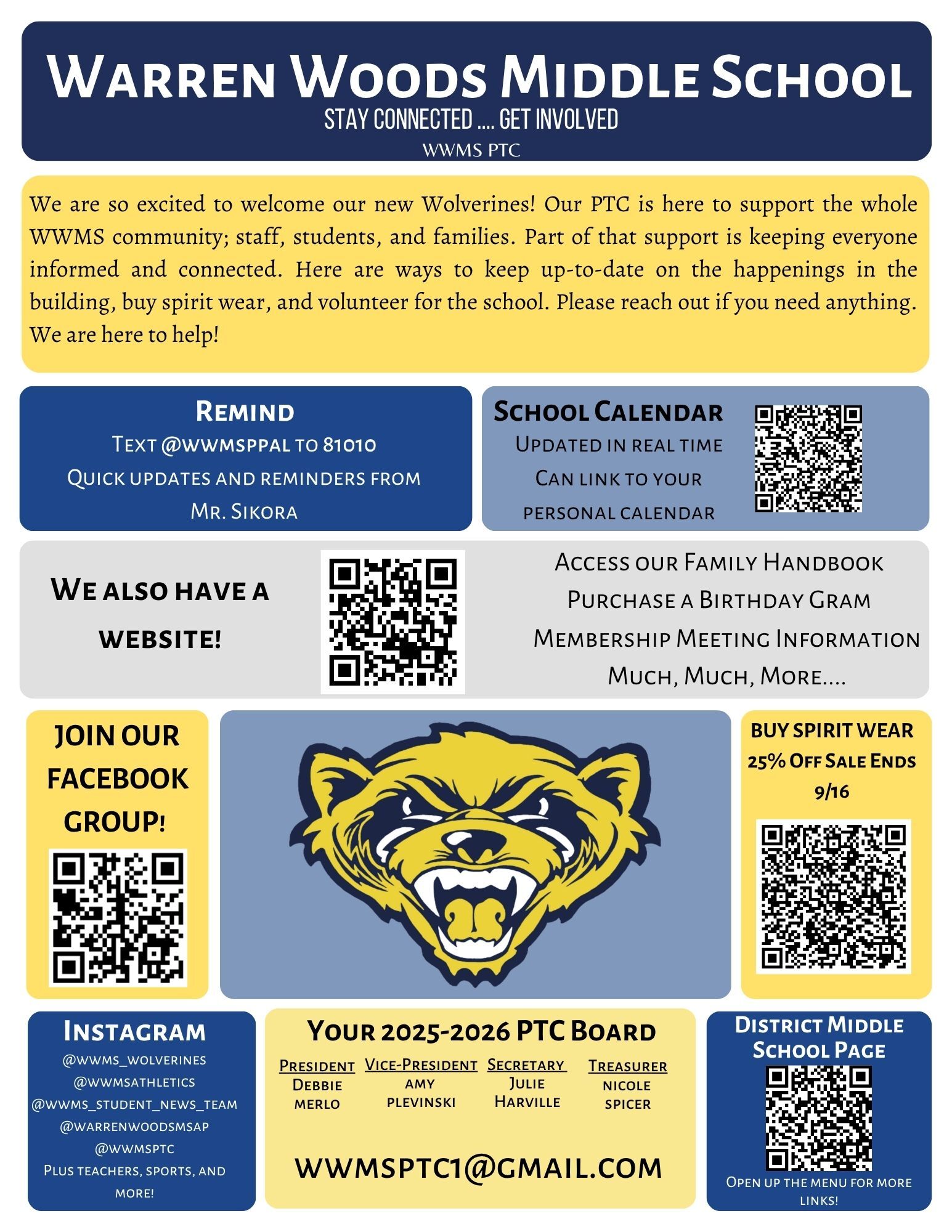 As a collective community, we understand that active parent/staff participation in school related activities/events is a necessity. An effective PTC needs an army of parents/guardians and staff working together in the best interest of our students. All in all, parental involvement can help us make the middle school years profitable ones for our students. If you are interested in joining our PTC, or if you would like additional information, please contact the WWMS PTC at: wwmsptc1@gmail.com.